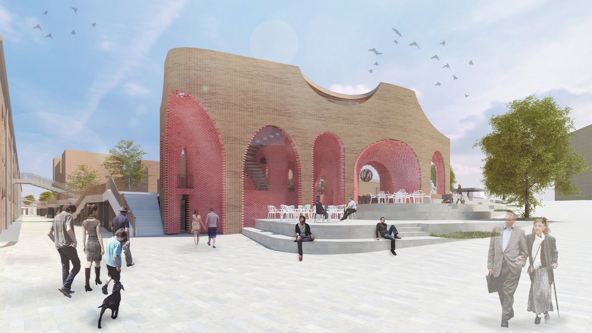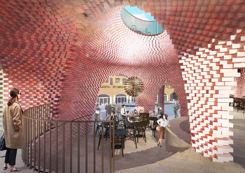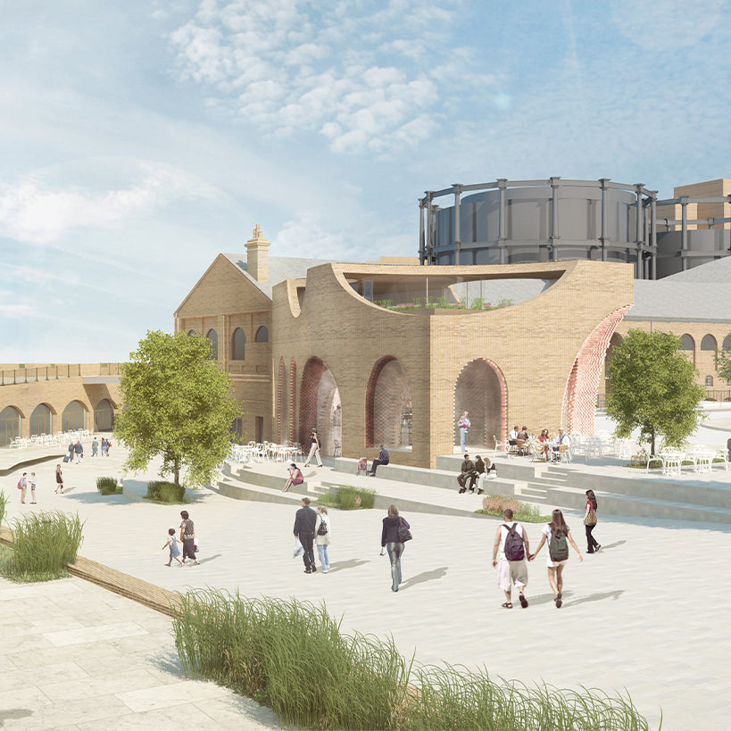A significant level difference exists between the square and the Coal Drops, and the new building responds to this context by creating a series of stepped terraces internally and externally. The context consists of industrial buildings made from traditional yellow london stock bricks, with openings formed by arches. The language of the pavilion interprets this context through a contemporary use of bricks and off-site assembly techniques.