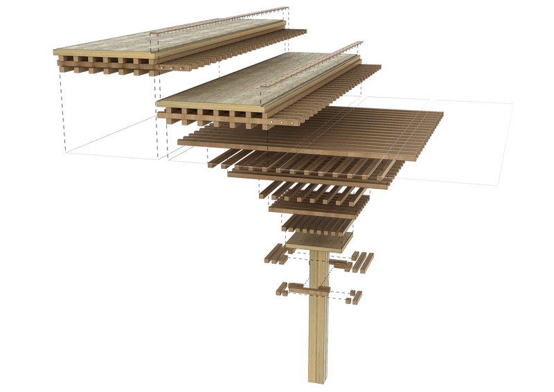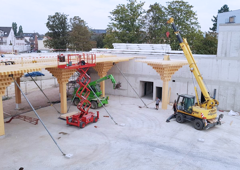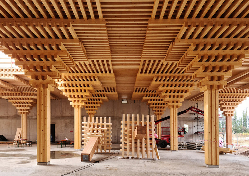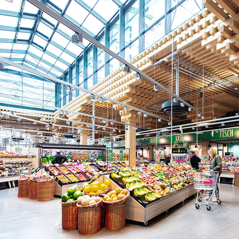 REWE Green Farming in Wiesbaden is a great timber market hall, where locally farmed and prepared produce is openly showcased by the architecture. An aquaponic farm is housed within the building and a modular greenhouse above. Transparency of the food making process is celebrated.