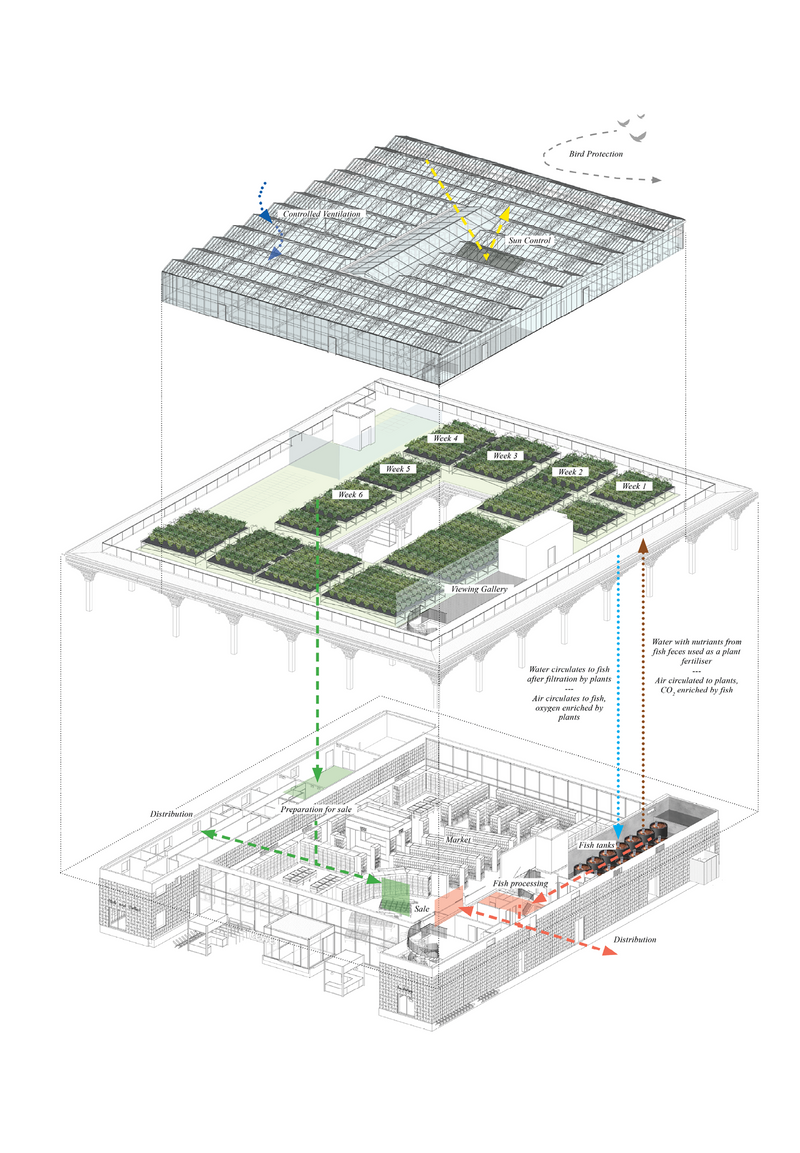 SIZE: 13,200m² site; 2,500m² market; 2,000m² aquaponic farm; 850m² drug store, 169 parking spaces