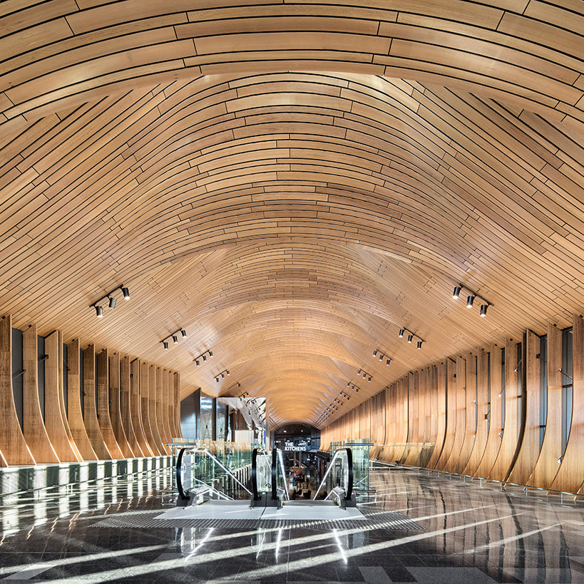 The structure is defined by a grand undulating roof resting above a new food lover’s hub below. The timber roof creates a dramatic space for market traders to host a variety of different local food, cooking and eating experiences.